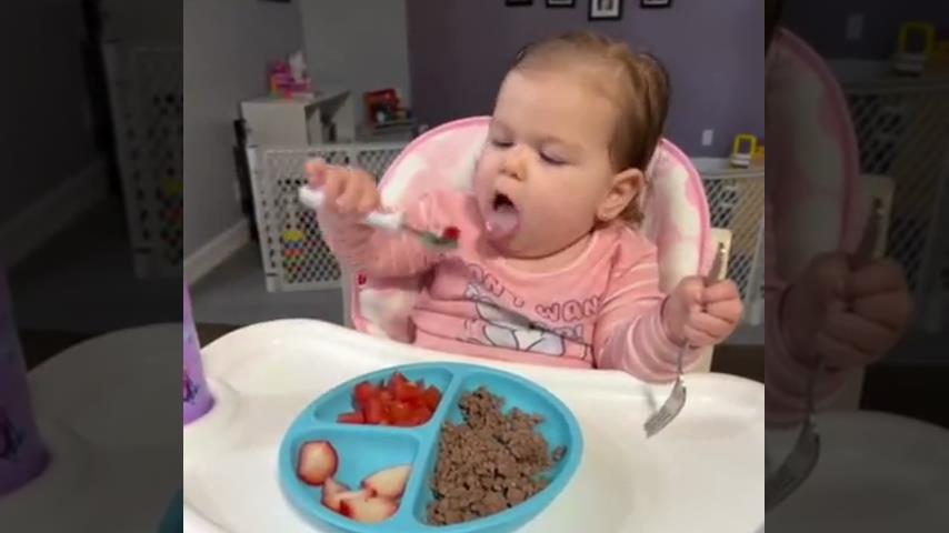 Ένα μωρό προσπαθεί επίμονα να φάει φρούτα με το κουτάλι του. Αρχικά δεν τα καταφέρνει, αλλά μετά από αρκετή προπόνηση θα πετύχει τον στόχο του.