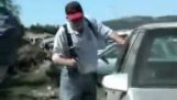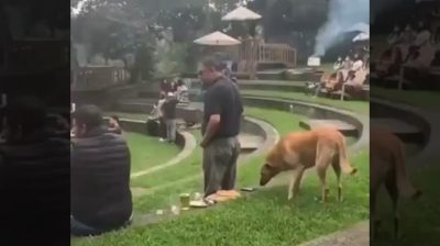 Ένας σκύλος πλησιάζει αθόρυβα πίσω από την πλάτη ενός άνδρα για να κλέψει την πίτσα του.