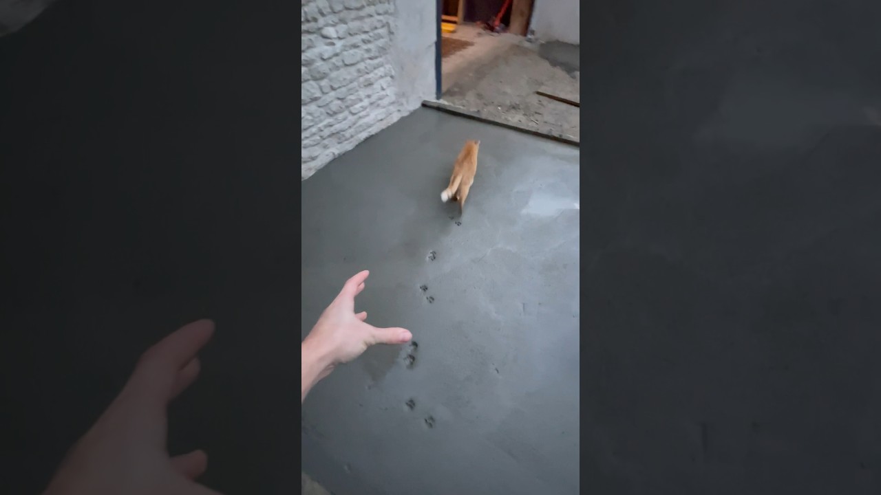Μια γάτα περπατά πάνω στο στο φρεσκο τσιμέντο που μόλις έστρωσε ένας άντρας στο αγρόκτημά του.