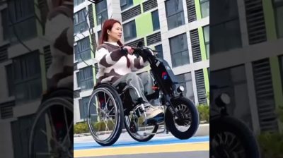 Ένας ηλεκτρικός τροχός με μπαταρία που μπαίνει στο εμπρόσθιο μέρος ενός αναπηρικού αμαξιδίου και το μετατρέπει σε ηλεκτρικό.