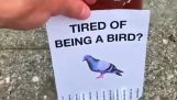 Next to the lady standing in front of the painted wings, a bird stands in front of painted hands.