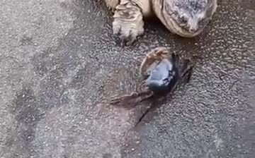 An unsuspecting crab passing by a turtle