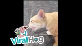 The cat shows her love for her owner by cuddling and purring.