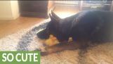 Trying to have some fun in the snow, this dog owners and his Dachshund pups play hockey!