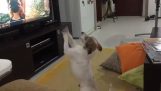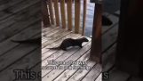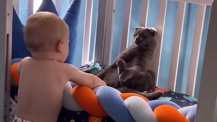 Μια γάτα μένει ακίνητη για να μην τραβήξει την προσοχή ενός μωρού.