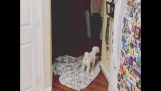 Lazy dog hits herself in the face with crate door