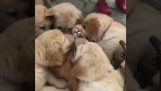 Ένας άνδρας δίνει ένα κομμάτι κοτόπουλου στον σκύλο του, αλλά αυτός αντί να το φάει θα το αφήσει στα κουτάβια...