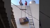 Δύο άνδρες τραβούν τη μονάδα ενός κλιματιστικού προς την ταράτσα ενός σπιτιού με σχοινιά. Όμως το ένα σχοινί θα σπάσει,...