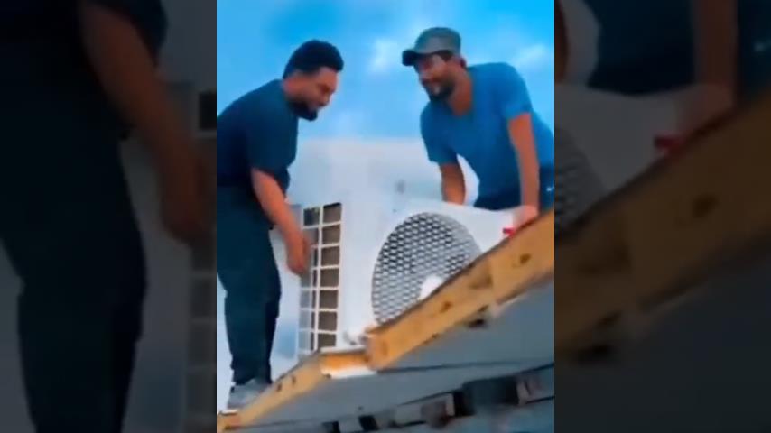 Προσπαθώντας να εγκαταστήσουν μια μονάδα κλιματισμού σε μια ταράτσα, δύο άντρες θα έχουν ένα αστείο ατύχημα.