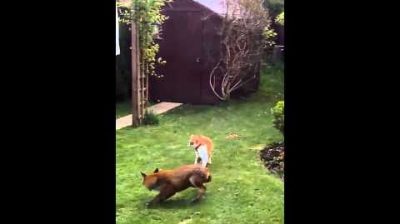 Δύο γάτες επιτίθενται και κυνηγούν μια αλεπού που τριγυρίζει ψάχνοντας φαγητό στην αυλή του σπιτιού.