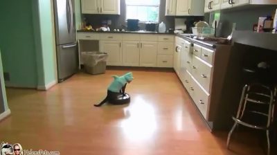 Μια γάτα με στολή καρχαρία (?!) κάνει βόλτες στην κουζίνα με μια αυτόματη ηλεκτρική σκούπα