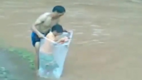 Μαθητές σε ένα χωριό του βορειοδυτικού Βιετνάμ αναγκάζονται να δισχίζουν το ποτάμι μέσα σε μια πλαστική σακούλα, ώστε να μη βραχούν στον δρόμο για το σχολείο. Στο βίντεο, δασκαλοι και μαθητές περιμένουν τη σειρά τους για να περάσουν απέναντι.