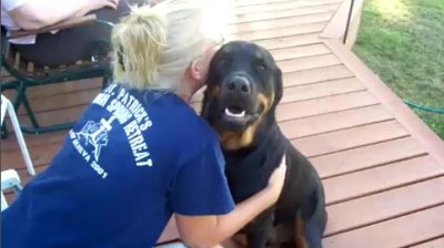 Ένα Ροτβάιλερ γουργουρίζει σαν γάτα όταν η ιδιοκτήτριά του το αγκαλιάζει.