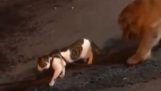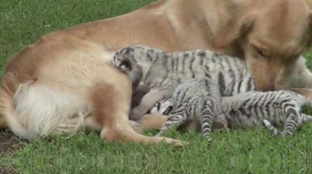 Η Ισαβέλλα, ένας σκύλος ράτσας γκόλντεν ριτρίβερ έγινε πρόσφατα για πρώτη φορά μαμά, αφού υιοθέτησε τρία νεογέννητα λευκά τιγράκια μετά την απόρριψή από τη μητέρα τους στο Ζωολογικό Πάρκο Safari του Κάνσας.