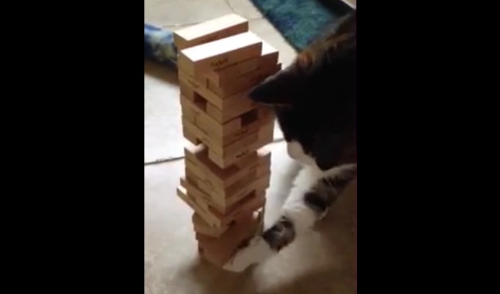 Ένας άνθρωπος και μια γάτα παίζουν Jenga. Μπορεί η τεχνική της γάτας να φαίνεται λίγο παράδοξη, όμως αποδεικνύεται ότι είναι ένας σοβαρός αντίπαλος…