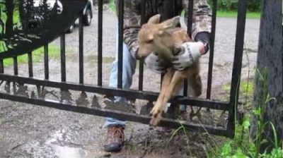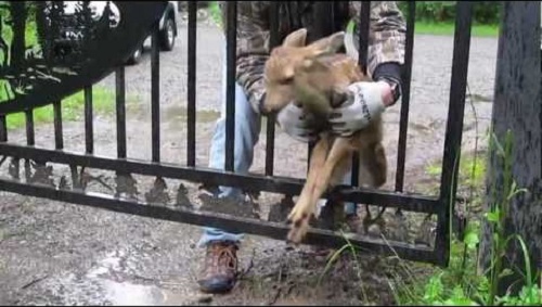 Ένας άνδρας βοηθά ένα μικρό ελάφι να απελευθερωθεί από τα κάγκελα μιας μεγάλης μεταλλικής πόρτας, στη Ουάσινγκτον. Αμέσως επιστρέφει στη μητέρα του που βρισκόταν κοντά και παρακολουθούσε.