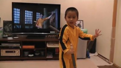 Μπροστά από την τηλεόραση που προβάλλει μια ταινία του Bruce Lee, ένας πιτσιρίκος 4 χρονών μιμείται τις κινήσεις του μεγάλου σταρ με τα νουντσάκου.
