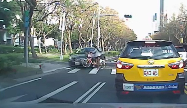 Στην Ταϊβάν, μια ποδηλάτισσα διασχίζει ένα δρόμο κατά μήκος της διάβασης πεζών, αλλά ένα αυτοκίνητο που πλησιάζει και δεν έχει ορατότητα, τη χτυπά με αρκετά μεγάλη ταχύτητα. Το όχημα χτυπά το μπροστά μέρος του ποδηλάτου, το οποίο περιστρέφεται με τέτοιο τρόπο ώστε να απομακρυνθεί από την αναβάτρια, που στέκεται όρθια και ξαφνιασμένη στη μέση του δρόμου χωρίς ούτε μια γρατσουνιά.