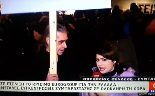 Κατά τη συνεδρίαση του Eurogroup το βράδυ της Τετάρτης, πολλοί διαδηλωτές έχουν μαζευτεί στο Σύνταγμα για να εκφράσουν τη συμπαράστασή τους για τις προσπάθειες της Ελληνικής κυβέρνησης. Ένας από αυτούς λέει απροκάλυπτα σε τηλεοπτικό σταθμό, τι αναγράφει το “ακάτάλληλο” πλακάτ του στα Γερμανικά.
