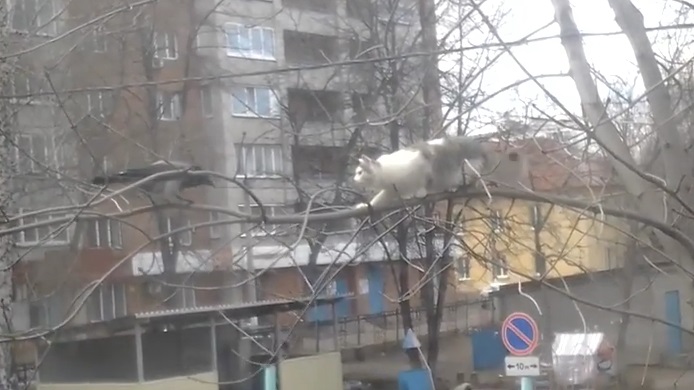Ένα έξυπνο κοράκι βασανίζει μια γάτα πάνω σε ένα δέντρο και τελικά ο κυνηγός… γίνεται κυνηγημένος. Θα μπορούσε εύκολα να πετάξει μακριά, αλλά αντίθετα το κοράκι αποφασίζει να πειράξει τη γάτα με το ράμφος του, καθώς αυτή προσπαθεί να ισορροπήσει πάνω στα κλαδιά. Μια πολύ αστεία σκηνή.