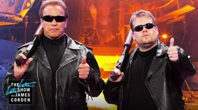 James Corden and Arnold Schwarzenegger act out snippets from Arnold’s huge film career, from Conan the Barbarian to Jingle All the Way.