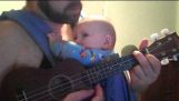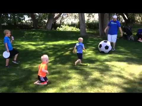 Ο πατέρας της χρονιάς προσπαθεί να παίξει ποδόσφαιρο με τα μικρά παιδιά του χρησιμοποιώντας μια τεράστια μπάλα.