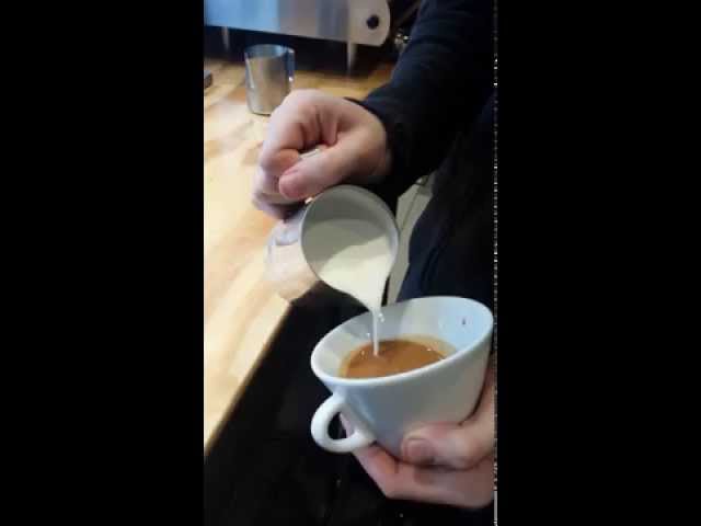 Ένας Ιταλός μπαρίστα, υψηλά ειδικευμένους επαγγελματίας στην προετοιμασία του καφέ, κάνει με κόπο ένα ωραίο σχέδιο με το γάλα στην επιφάνεια του καπουτσίνο πριν το σερβίρισμα σε έναν πελάτη…