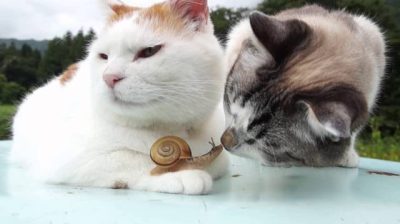 Δύο γάτες γνωρίζονται για πρώτη φορά με ένα σαλιγκάρι.