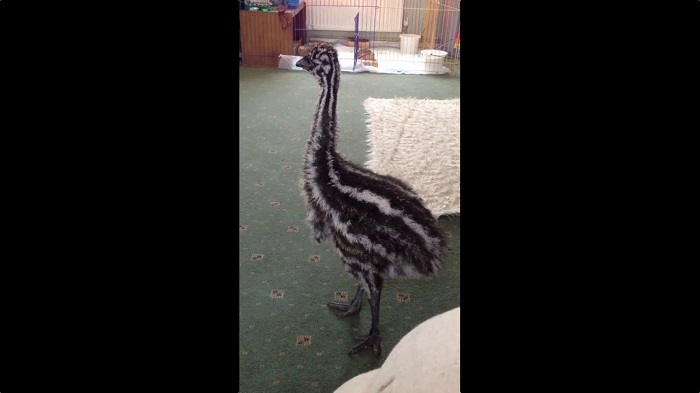 Σε ένα σπίτι, ένα μωρό εμού είναι ενθουσιασμένο βλέποντας τον σκύλο να μπαίνει στο δωμάτιο. Θα κάνει μια τούμπα, θα αρχίσει να τρέχει και να πηδά για να προσελκύσει την προσοχή του σκύλου και να παίξει μαζί του.