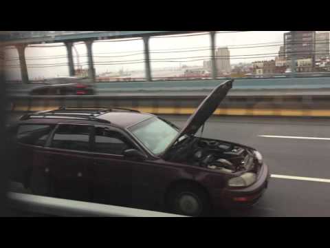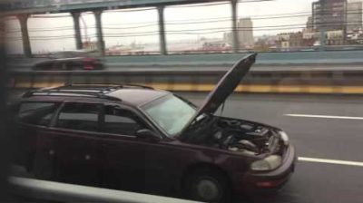 Philadelphia, PA 2/24/16 – A driver on the Benjamin Franklin Bridge had his hood flip open and continues driving.