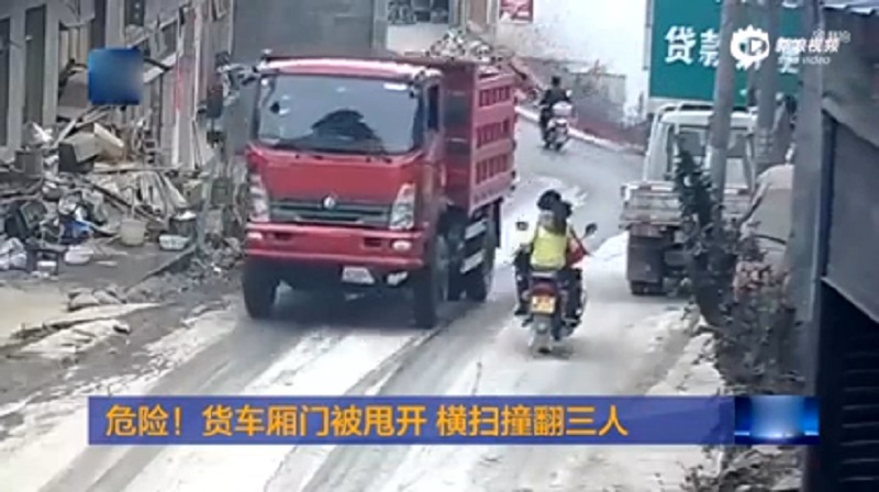 Στις αρχές του Μαρτίου στην πόλη Bijie της Κίνας, συνέβη ένα απίθανο ατύχημα με μια μοτοσικλέτα και ένα φορτηγό. Η μοτοσικλέτα στην οποία επέβαινε μια τριμελής οικογένεια, περνά δίπλα από ένα ανατρεπόμενο φορτηγό όταν η πόρτα του κάδου του φορτηγού ξαφνικά ανοίγει. Η πόρτα χτύπησε τους αναβάτες της μηχανής και τους έριξε στο έδαφος. Ευτυχώς, δεν υπήρξαν θύματα.