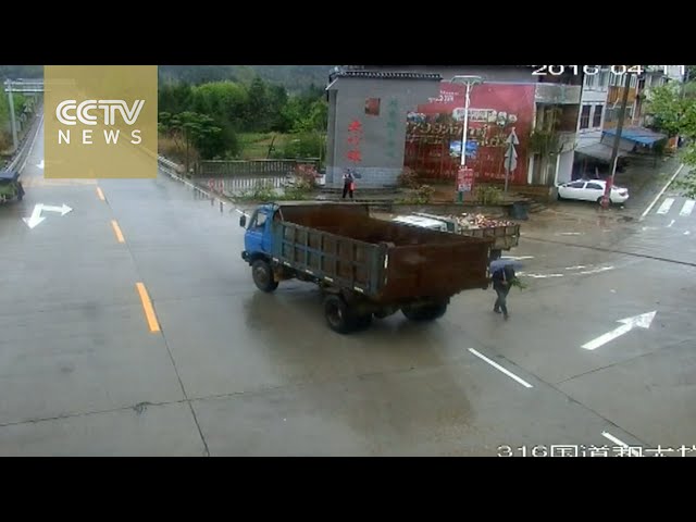 Πλάνα από κάμερα παρακολούθησης στην Κίνα καταγράφουν τη στιγμή που ένας πεζός γλιτώνει από χτύπημα ενός ανατρεπόμενου φορτηγού εκτός ελέγχου, που τελικά συγκρούεται με ένα απορριμματοφόρο. Το πίσω άκρο του ανατρεπόμενου φορτηγού σχεδόν χτύπησε τον πεζό, ο οποίος ήταν φαινομενικά ανίδεος για το τι συνέβαινε μέχρι τη σύγκρουση με το απορριμματοφόρο.