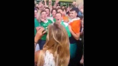 This is the moment hundreds of lovestruck Irish football fans gathered around a blonde French girl and serenaded her (left) with romantic songs. A hilarious video showed the swaying crowds singing Can’t Take My Eyes Off You and Hey Baby to the laughing young woman in Bordeaux. They appeared in high spirits despite losing three-nil to Belgium on Saturday, and one man even stole a kiss from the woman at the end (right).