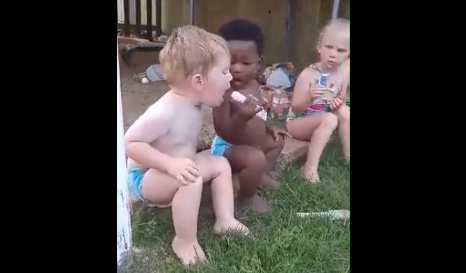 Ένα μικρό αγόρι τρολάρει τον φίλο του που θέλει απεγνωσμένα να φάει λίγο παγωτό.