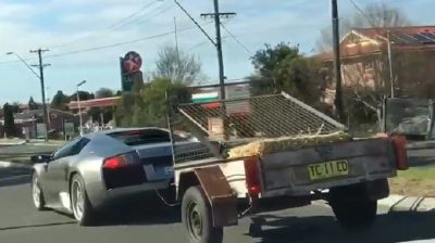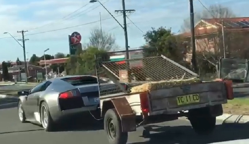 Ένας άνδρας χρησιμοποιεί μια Lamborghini Murcielago για να μεταφέρει κατσίκες σε ένα τρέιλερ.