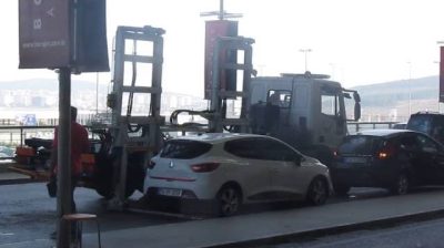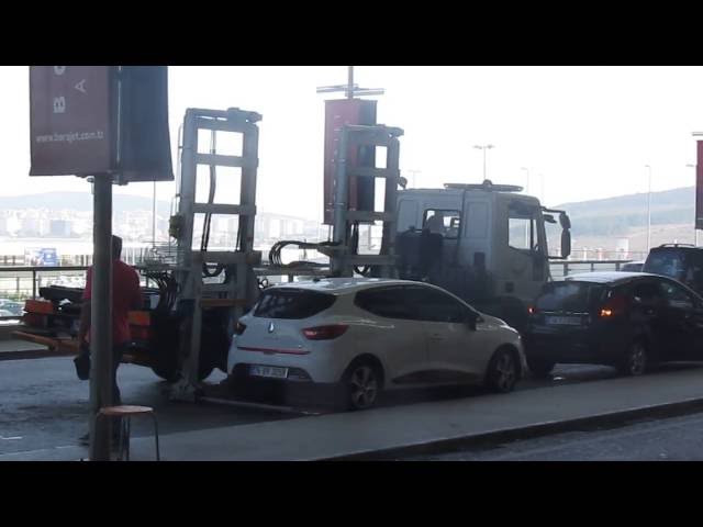 Σε ένα αεροδρόμιο στην Τουρκία, ένα φορτηγό ρυμούλκησης αφαιρεί ένα παράνομα παρκαρισμένο αυτοκίνητο. Το όχημα είναι εξοπλισμένο με ανυψωτικά πιρούνια που αρπάζουν το αυτοκίνητο και το ανεβάζουν στο φορτηγό σε λιγότερο από ένα λεπτό.
