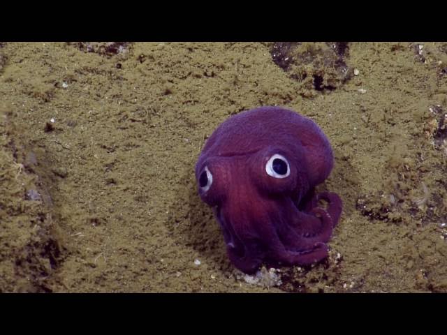 Το πλήρωμα του ερευνητικού σκάφους Nautilus είχε μια ασυνήθιστη συνάντηση με ένα “κοντόχοντρο” καλαμάρι (Rossia pacifica) σε βάθος 900 μέτρων στα ανοικτά των ακτών της Καλιφόρνιας. Με τα μεγάλα γουρλωμένα μάτια του, το μοβ καλαμάρι φαινόταν να παρακολουθεί το τηλεχειριζόμενο όχημα παραμένοντας ακίνητο.