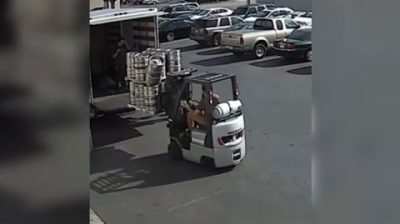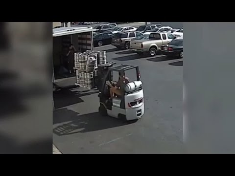 رجل على رافعة شوكية حفظ برميل من البيرة