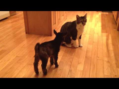 طفل الماعز يحاول نطحة القط