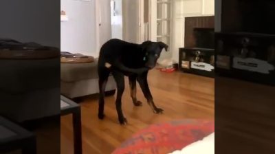 بعد مطاردة طويلة, وقد تمكنت هذا الكلب أخيرا للقبض على الذيل. وبعد أن تجتاح تماما فريسته مع الفم, نقل بعناية حتى لا يترك.