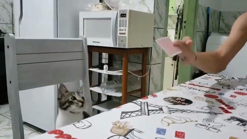في جدول, رجل يقوم خدعة مع أوراق اللعب أمام القط. التظاهر لرمي بطاقة اللعب, لكن حركة واحدة سريعة يخفي في يده قبل الطاير. يبدو القط في اطلاق النار بدقة, ولكن لا يمكن فهمه هو أن بطاقة.