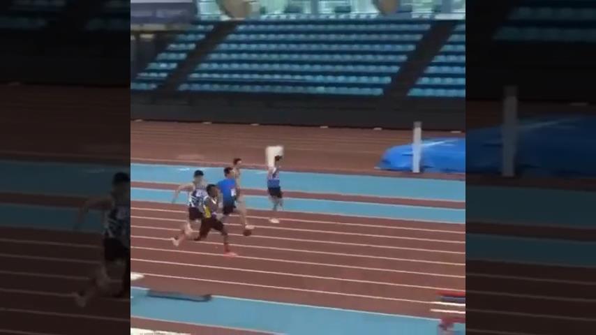 بعد أن خرج أولاً في سباق سريع, عداء يتعثر ويسقط في استراحة تحت مدرجات الاستاد. لحسن الحظ, ولم يصب.