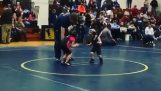 صبيان صغيران من نفس العمر لكن بنية بدنية مختلفة, يواجهون في مباراة مصارعة.