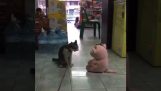 هرة صغيرة ومعركة القط كبيرة في مباراة مثيرة المصارعة. سوف القط ليس لديهم أمل.