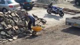 العبقري يفتح خزان دراجة نارية محترقة, مع مجرفة. أخيرا نعم, حدث ما فكرت فيه.