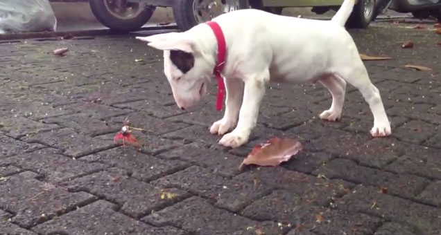 جرو بول الكلب يحاول اللعب مع سرطان البحر.