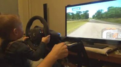 كونستا فتى من فنلندا يبلغ من العمر 3 سنوات, الذين هنا يلعب 'ريتشارد بيرنز رالي' سباق لعبة على الكمبيوتر والده. الصغيرة يؤدي التجمع, على الرغم من أن والده يتحكم الخانق والفرامل.