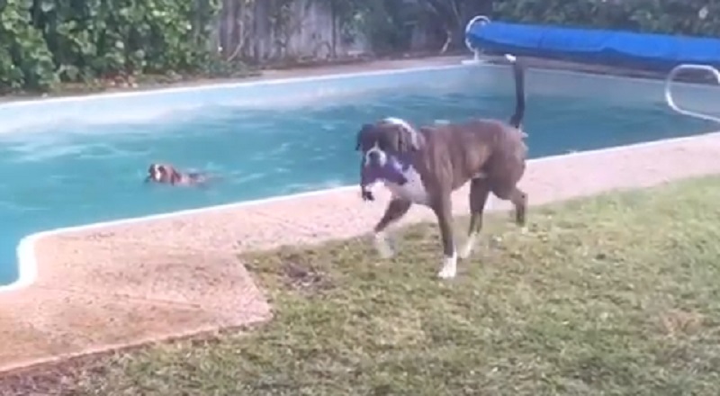 كلب يدعى أن له لعبة يندرج في حمام السباحة وانتظر صديقة الموقع عبر, حتى في محاولة للقبض على.