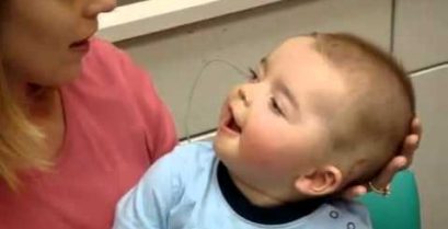 هذا الطفل يبلغ من العمر 8 أشهر وولد أصمًا. بعد عملية إضافة زرع قوقعة الإذن إذن وأعطاه الفرصة للاستماع مرة أخرى. هذه هي المرة الأولى التي يتم تنشيط عملية الزرع, ونسمع أصوات الأولى وصوت والدته.