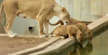 علوم الحيوان الوطنية بارك، واشنطن, لبؤة يدفع أبروسيتشتا الصغيرة داخل الماء.